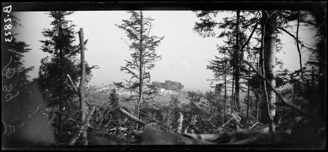 Hartmannswillerkopf (région de l'). L'Hirzenstein vu de la tranchée française de première ligne.