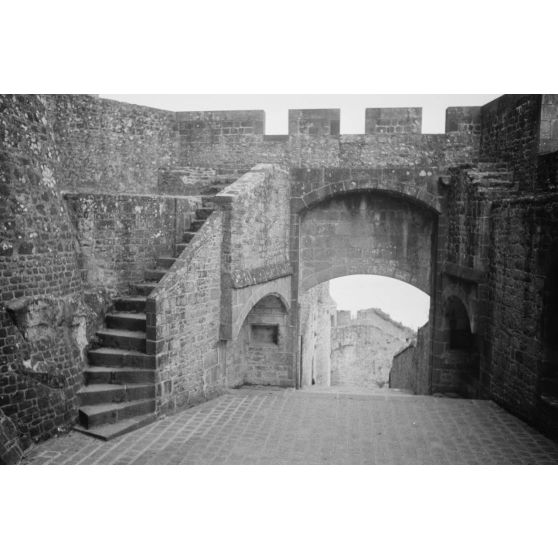 L'intérieur de l'abbaye du Mont-Saint-Michel lors d'une visite de marins de la Kriegsmarine (image floue).