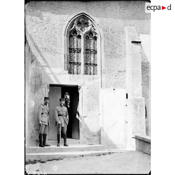 A la porte de l'église d'Essey-lès-Nancy, deux officiers sont photographiés à côté d'une pierre tombale.