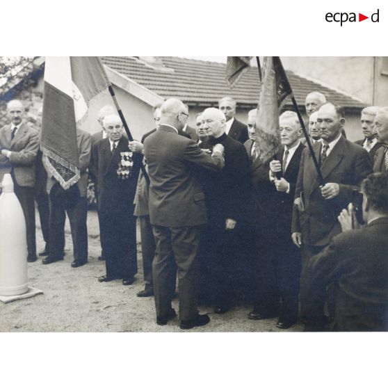 77. Remise de la légion d'honneur à M. l'Abbé Loys Roux par son frère André chevalier le 28 août 1960 au monument aux morts des deux guerres à Chénas Rhône.