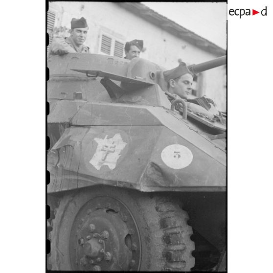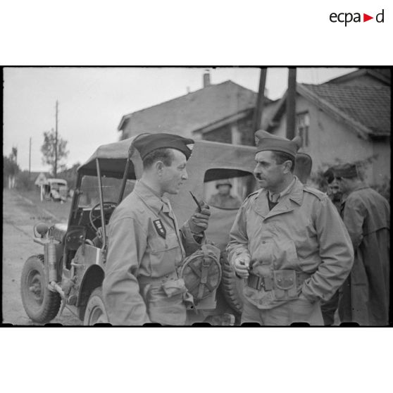 (2) La 2e DB comporte essentiellement trois groupements tactiques (de Langlade, Dio et Billotte). Celui du colonel de Langlade, articulé en 2 sous-groupements (Massu et Minjonnet) rassemble le 2e bataillon du RMT du commandant Massu, le 12e RCA du colonel de Langlade (adjoint : le commandant Minjonnet), le 4e escadron du RBFM du lieutenant de vaisseau Richard, le 1/40e RANA (1er Groupe d'automoteurs du chef d'escadron Weil), la compagnie du 13e bataillon du Génie du capitaine Germain et le 2e escadron de reconnaissance du RMSM du capitaine Pallu.