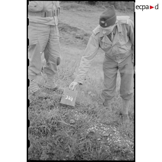 Un lieutenant du 22e groupe colonial des forces terrestres anti-aériennes (22e FTA) montre au photographe une charge explosive.