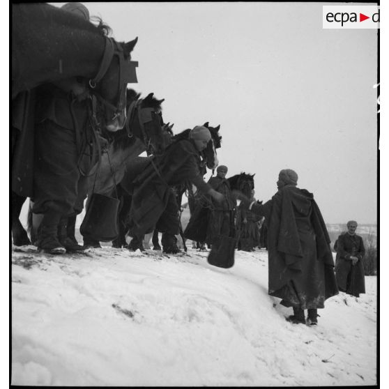 Spahis de la 3e BS (brigade de spahis) au bord d'une mare gelée dans un décor enneigé.