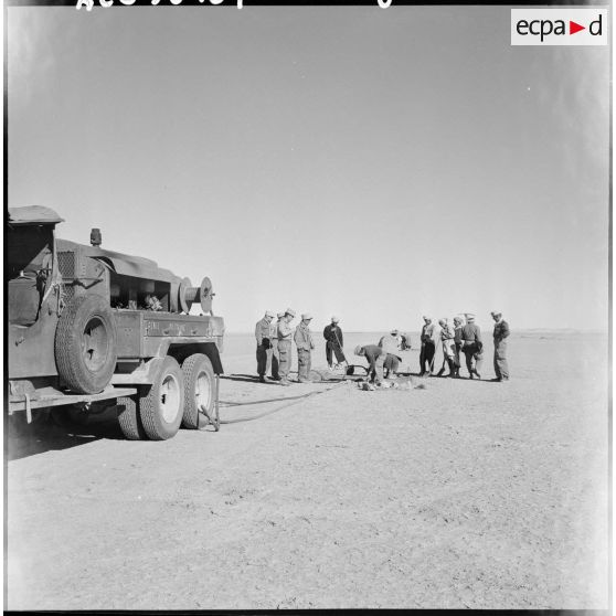 Les hommes de la 3e compagnie saharienne du Génie (3e CSG) travaillent au balisage d'un terrain d'aviation dans le Tanezrouft.