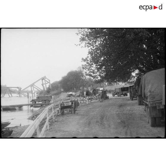 Défense anti-aérienne du pont flottant sur une berge du Rhin à Spire.