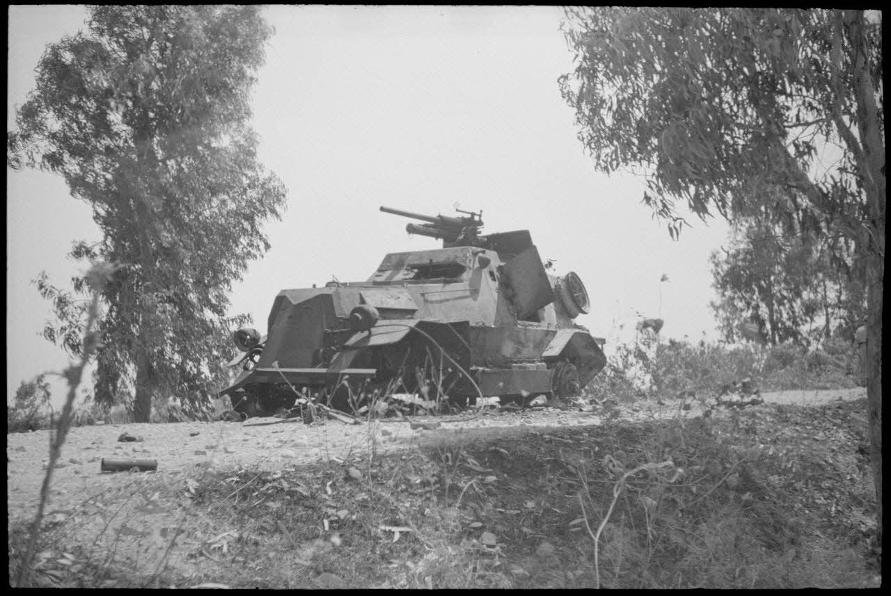 Des blindés britanniques se sont approchés dangereusement des lignes allemandes, mais l'action commune d'un canon de 8,8 cm et des canons d'assaut Sturmgeschütz III ont eu raison des scout cars. Les carcasses de trois scout cars dont des Marmon-Herrington MK II (équipés de canons antichars) finissent de se consumer. Sur la porte d'un des véhicules britanniques, l'insigne divisionnaire (5th Reconnaissance regiment/ Reconnaissance corps, clichés L 13 et L 14) est visible.