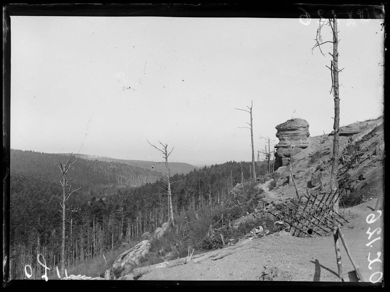 - à Hartmannswillerkopf ou Vieil-Armand (Haut-Rhin) : des correspondants de guerre dans une tranchée, tranchée et le sommet dévasté, un groupe de chasseurs sur un versant ;