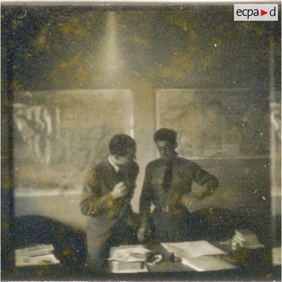 Au rang des premiers collaborateurs, on découvre Jean Lacouture en conversation avec un sous-lieutenant de l'armée de l'Air (D145-17-1, D145-17-10, D145-17-8, D145-17-9, D145-17-9BIS)." (Claude Brézillon)