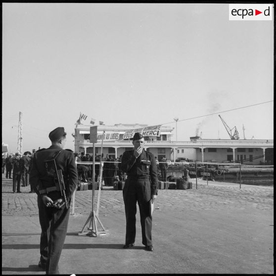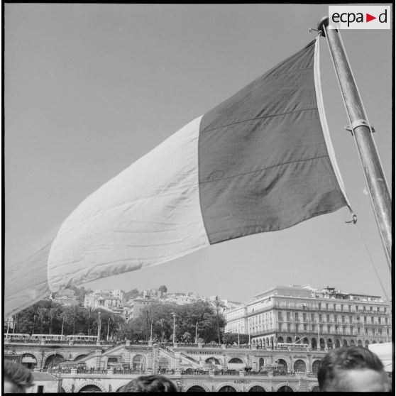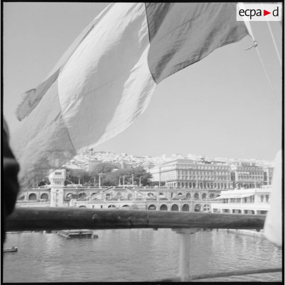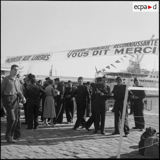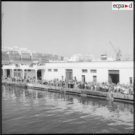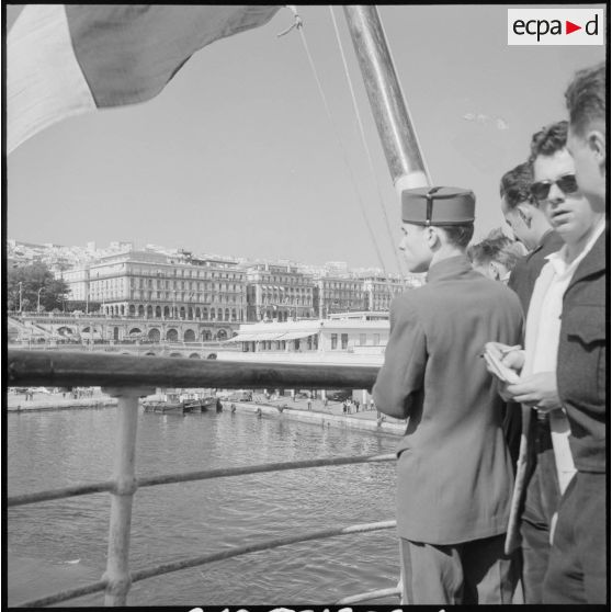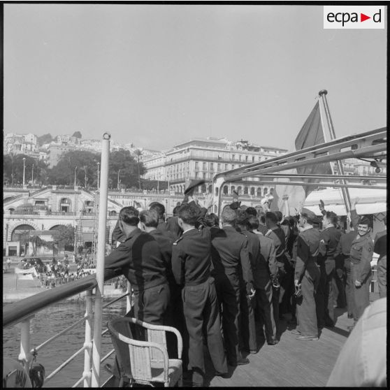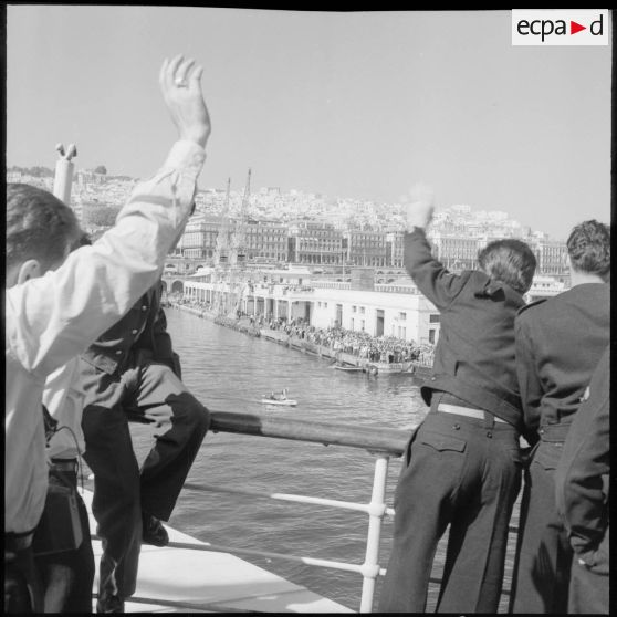 Les rappelés quittent le port d'Alger à bord du Kairouan et saluent les personnes venues sur les quais.