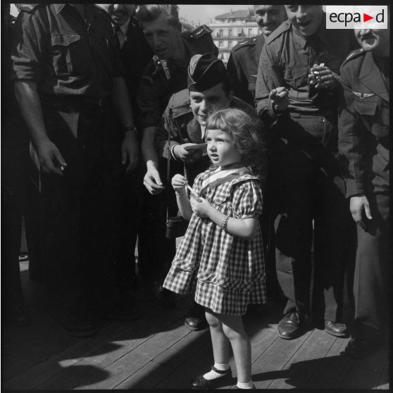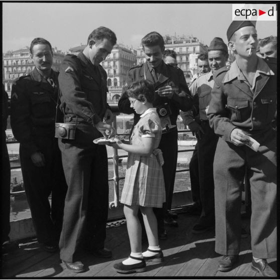 Une jeune fille distribue des cigarettes aux rappelés à bord du Kairouan.