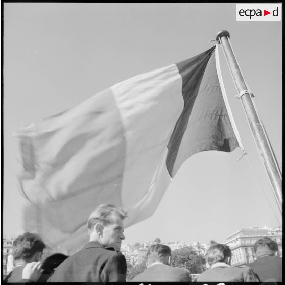 Depuis le pont arrière du Kairouan, les rappelés saluent les personnes restées à quai.