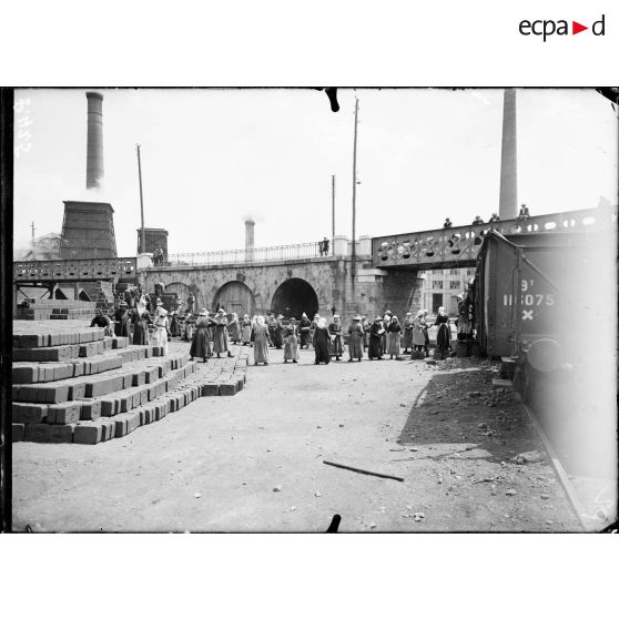 La Grand-Combe (Gard). (Le camp des prisonniers allemands travaillant aux mines de charbon). Femmes chargeant des briquettes.