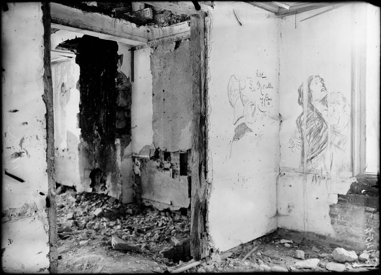 La Harazée. Dans la villa qu'habita le Kronpriz et qui fut ensuite incendiée par les Allemands lors de leur départ. Etat actuel de la chambre où coucha le Kronpriz. [légende d'origine]