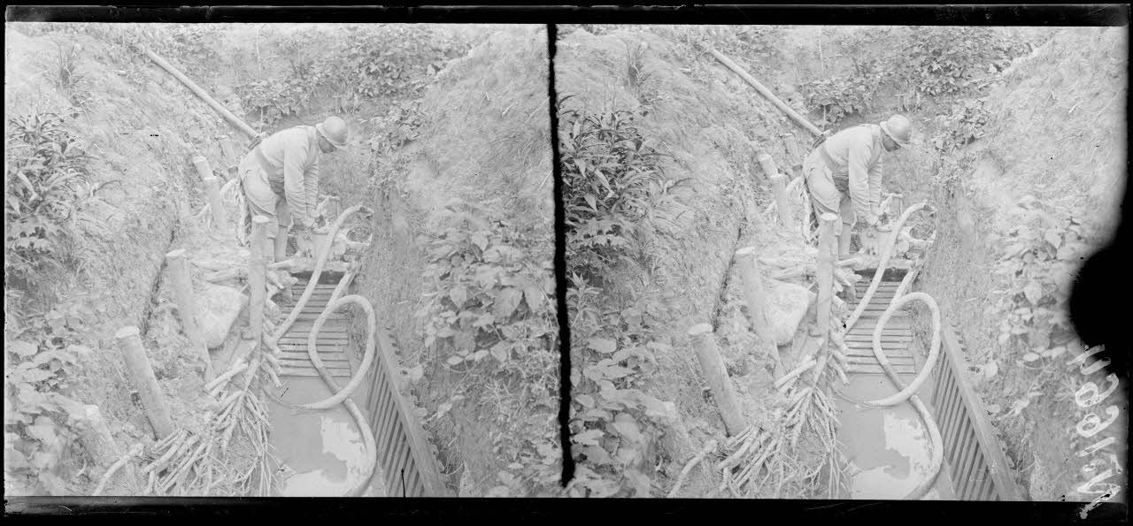 La Harazée (Marne). Secteur Condé. Dans les boyaux inondés : épuisement de l'eau (11-7-17). [légende d'origine]