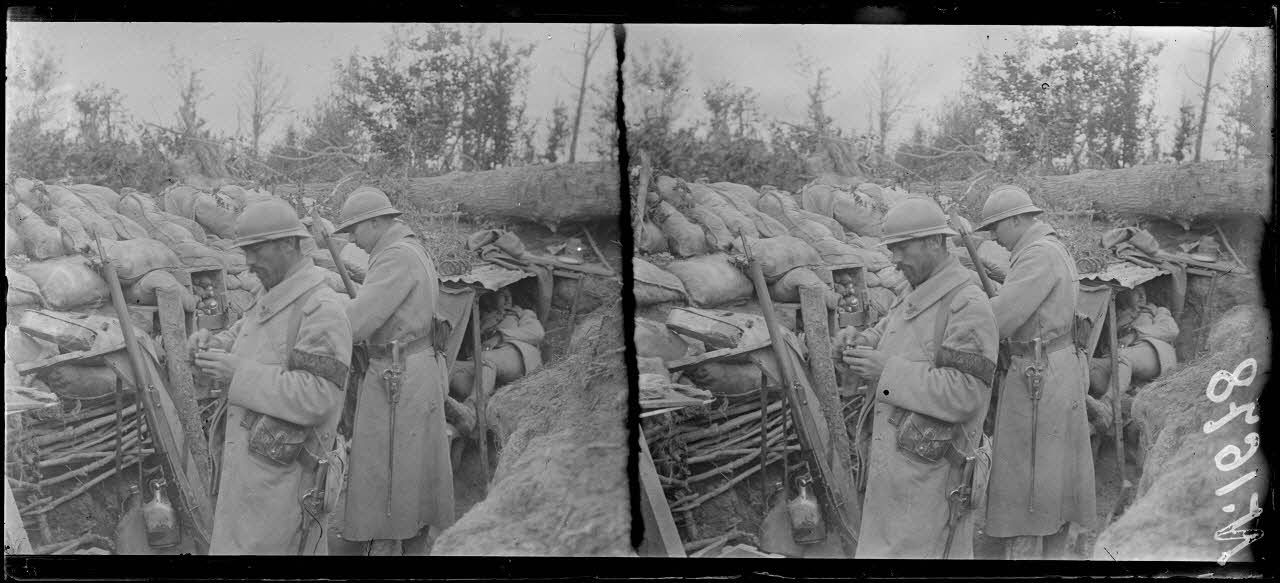 - Dans le secteur de La Harazée, les soldats se reposent entre deux gardes dans les abris construits à flanc de coteau. Au camp Condé, les hommes prennent la soupe. Du fil de fer barbelé est déchargé de camions pour être acheminé vers les réseaux. Un guetteur est installé dans son poste d'observation. Le commandant de la compagnie interroge le chef de section sur l'activité du jour. Dans les tranchées inondées par les pluies, les soldats évacuent l'eau avec une pompe. Des postes d'artillerie de tranchée sont installés à côté des postes d'observation. Des grenadiers voltigeurs du 296e RI (régiment d'infanterie) nettoient leurs armes, notamment le tromblon lance-grenades Vivien Bessières.
