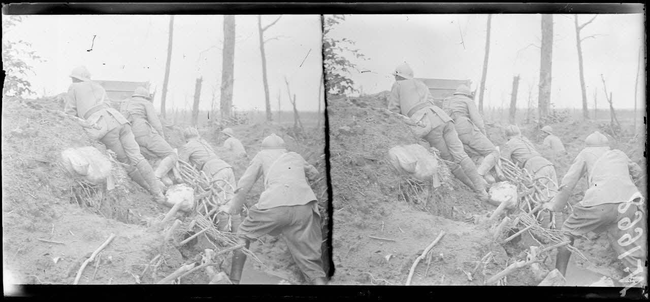 - Dans le secteur de La Harazée, les soldats se reposent entre deux gardes dans les abris construits à flanc de coteau. Au camp Condé, les hommes prennent la soupe. Du fil de fer barbelé est déchargé de camions pour être acheminé vers les réseaux. Un guetteur est installé dans son poste d'observation. Le commandant de la compagnie interroge le chef de section sur l'activité du jour. Dans les tranchées inondées par les pluies, les soldats évacuent l'eau avec une pompe. Des postes d'artillerie de tranchée sont installés à côté des postes d'observation. Des grenadiers voltigeurs du 296e RI (régiment d'infanterie) nettoient leurs armes, notamment le tromblon lance-grenades Vivien Bessières.