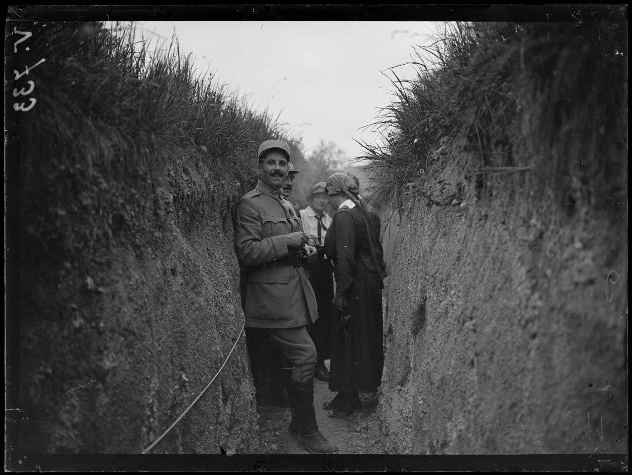 Cette mission, composée de mesdames Turmpacher, Harper et Kinney, se déplace ensuite à La Neuvillette (environ 5 km au nord de Reims) et sur les bords du canal de l'Aisne aux Cavaliers de Courcy, où sont visibles les premières lignes ennemies.Lors de la visite, un lâcher de pigeons voyageurs est effectué devant la délégation (V 725). Cette même délégation arpente une tranchée, où, pour des raisons de sécurité, les visiteurs doivent se cacher de l'observation ennemie.