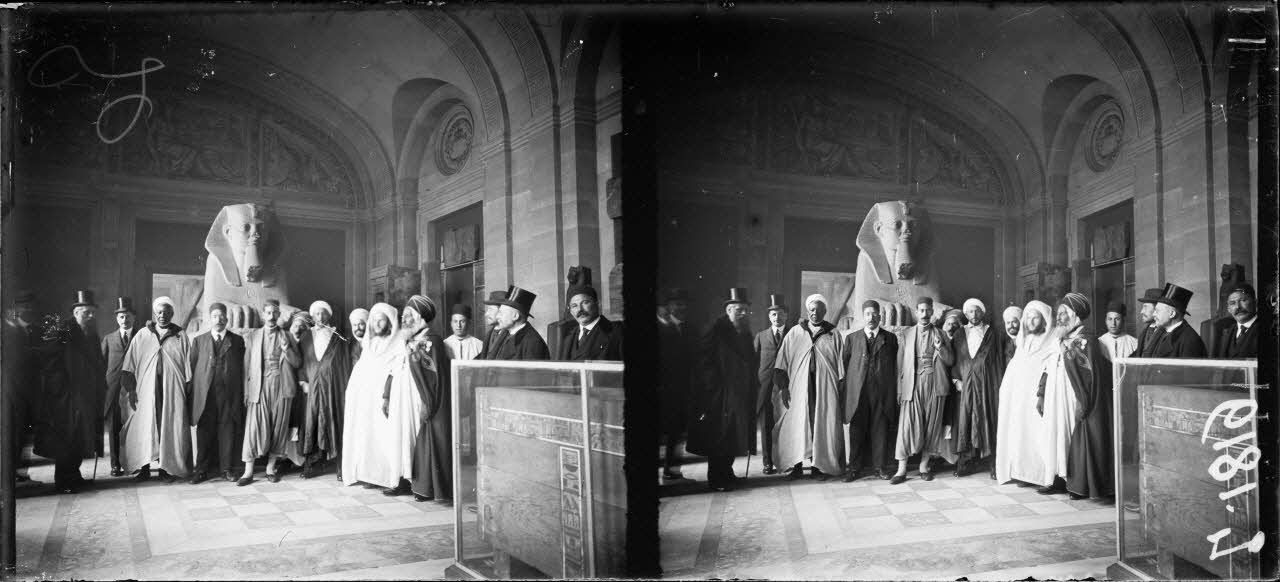 La mission musulmane dans une salle au musée du Louvre, devant le Sphinx. [légende d'origine]