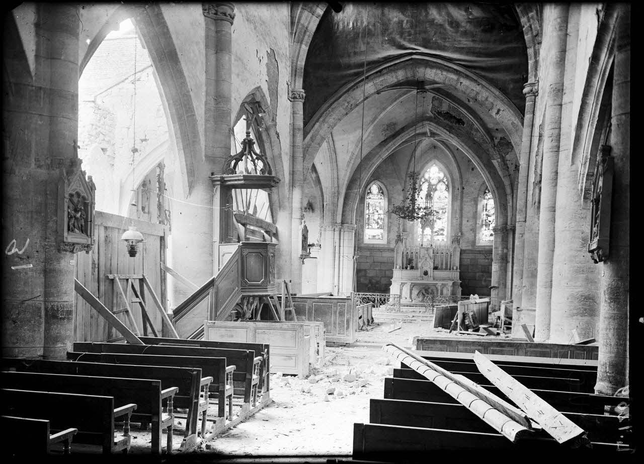 Vue de l'intérieur de l'église dévastée, bancs et voutes endommagés, débris au sol.