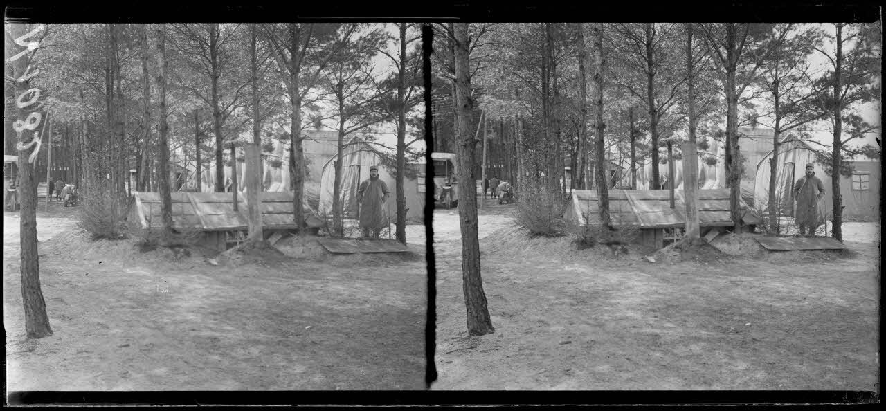 La Noblette (Marne). Camp d'aviation. Cantonnement des aviateurs sous bois (avril 1917). [légende d'origine]