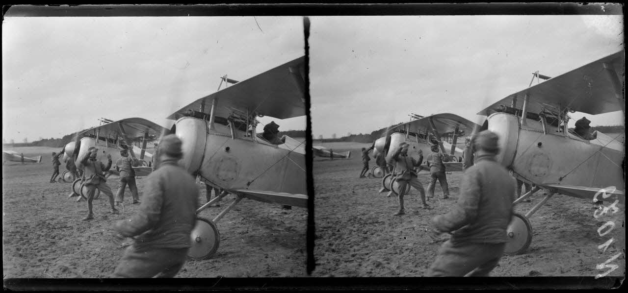 La Noblette (Marne). Camp d'aviation. Départ d'une patrouille d'avions de chasse (avril 1917).