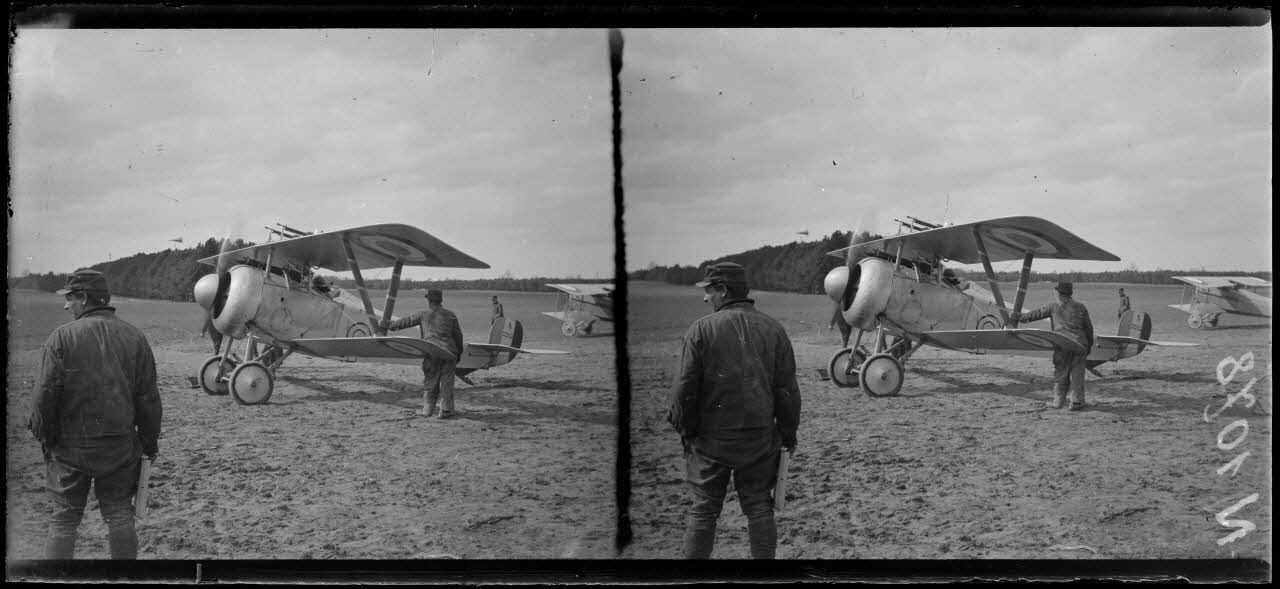 Après avoir effectué des réglages de tir, les appareils prennent les airs. Au sol, l'adjudant Georges Madon (photo E 1077), et l'adjudant Bernard Barny de Romanet (photo E 1077), futurs as de la chasse, se préparent à monter dans leurs appareils. Le personnel de la base examine un Albatros capturé et repeint aux couleurs françaises.