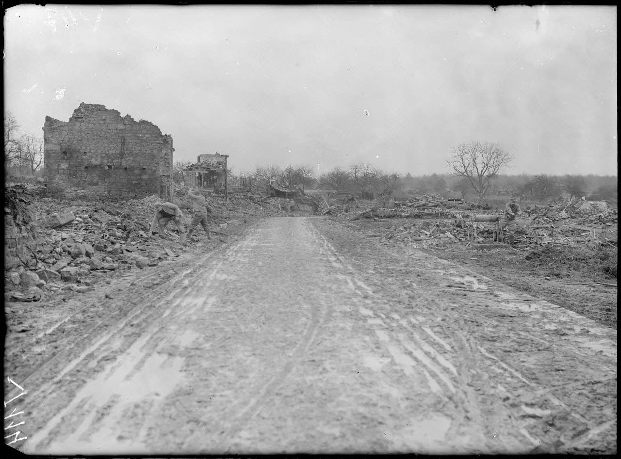 - Á Vienne-le-Château (Marne, 03/12/1915, V 115, V 128 et V 131) le village en partie détruit est occupé par les troupes françaises. Un soldat est contrôlé par un gendarme.