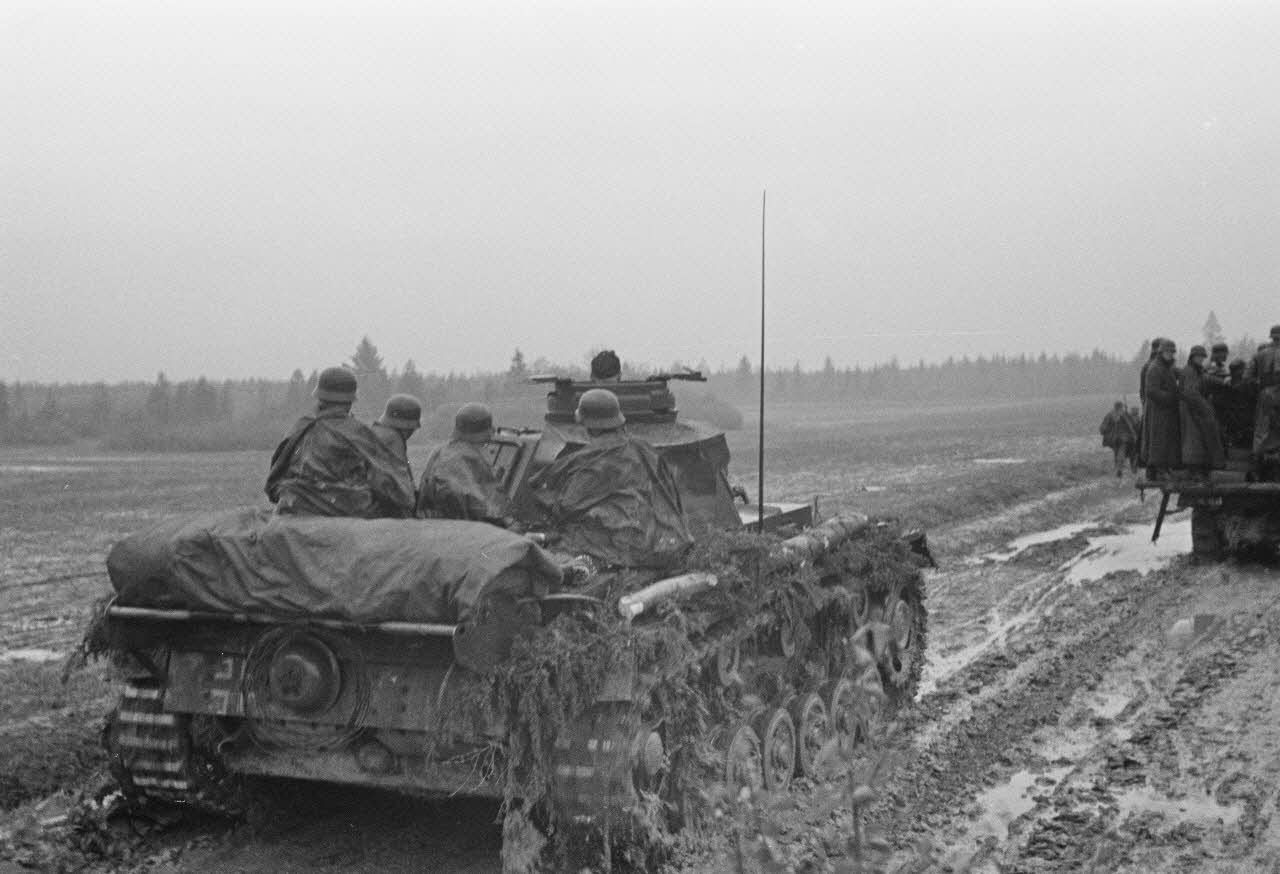 La progression de fantassins allemands soutenus par des blindés Panzer-III et un semi-chenillé Sd.kfz.6/2.