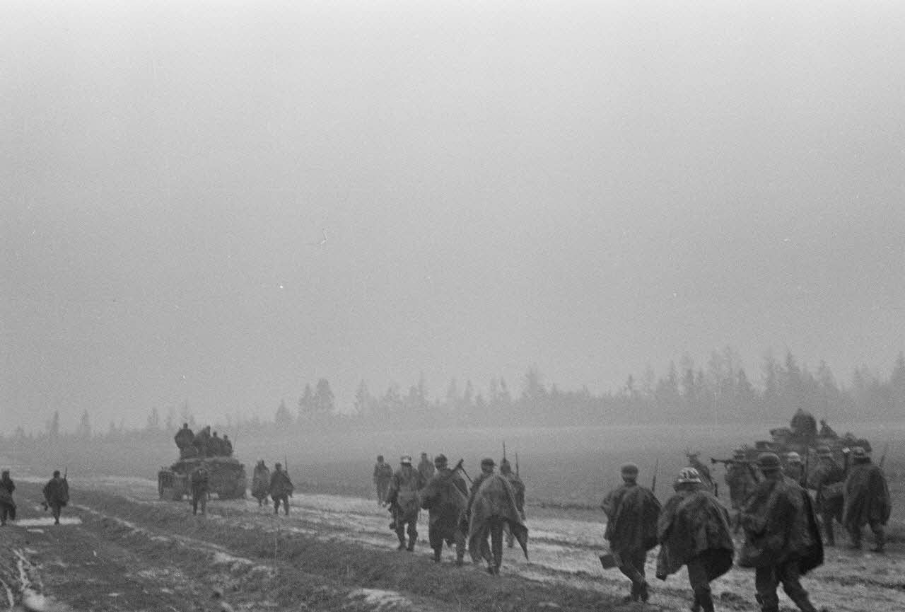 La progression de fantassins allemands soutenus par des blindés Panzer-III et un semi-chenillé Sd.kfz.6/2.