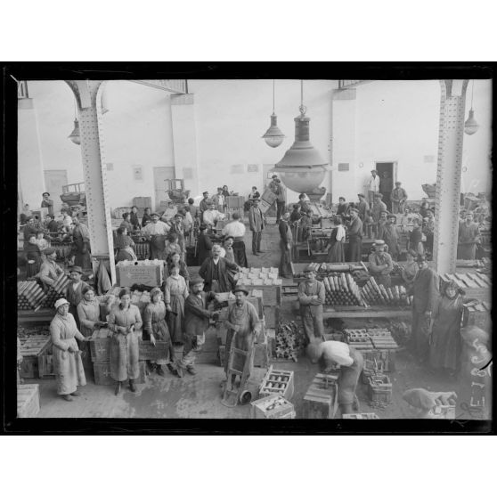 Toulon. pyrotechnie. Bâtiment X. Transport d'obus de 75 chargés à l'atelier d'encartouchage.