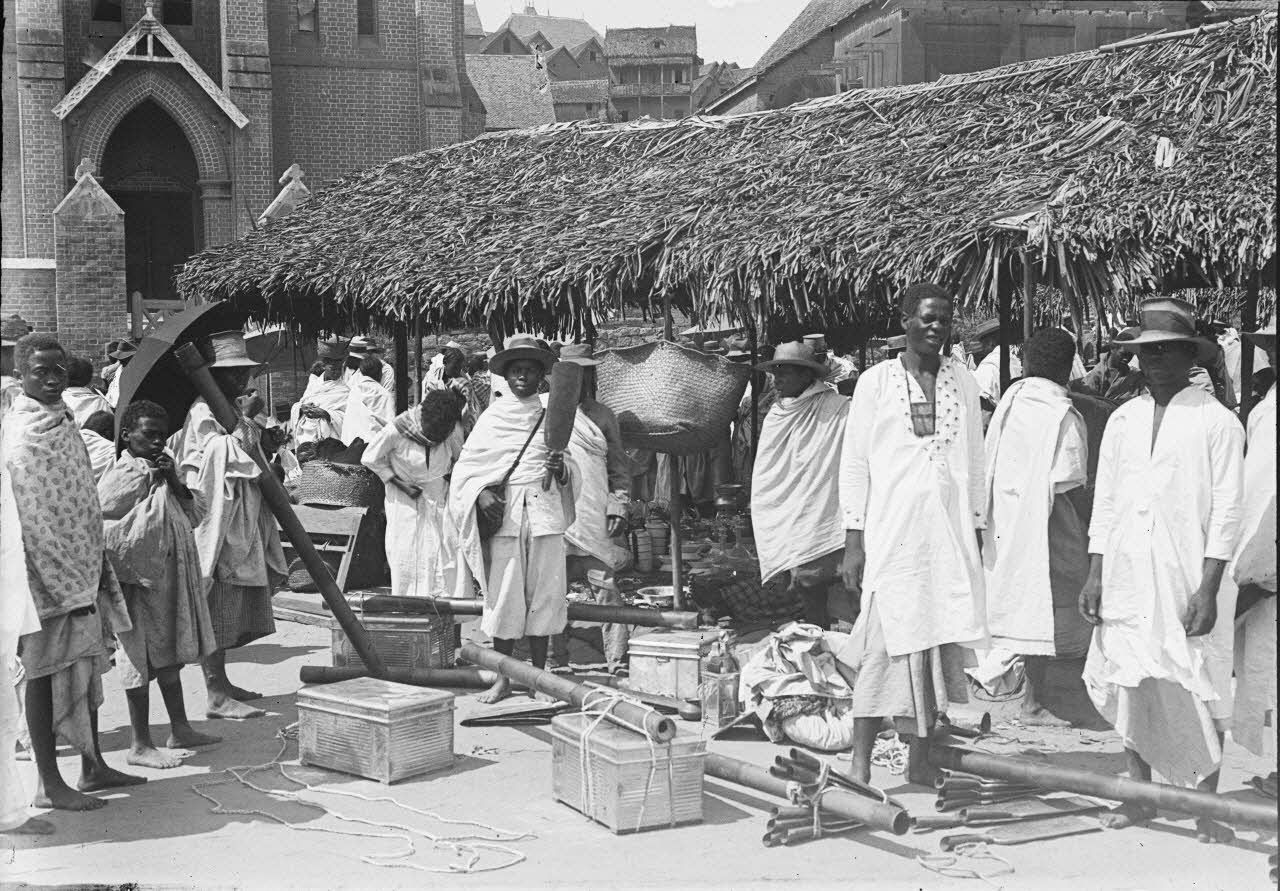 Edgard Imbert (1873-1915), sous-lieutenant de l'infanterie coloniale et photographe est en poste à Madagascar du 10 février 1900 au 23 avril 1902. Arrivé à Tananarive, il photographie l'architecture de la ville, la population, la vie quotidienne et notamment le marché.