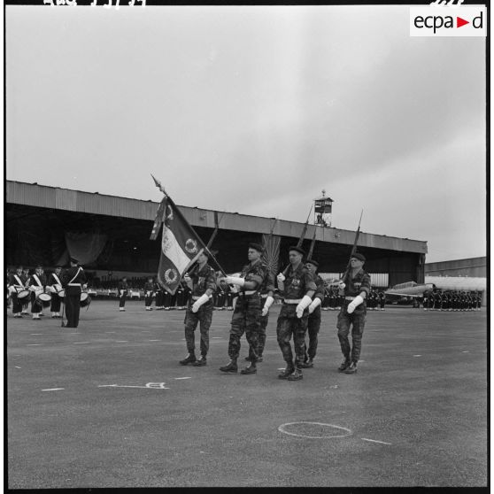 Remise du drapeau au commando de l'Air par le général Jouhaud, sur la base aérienne 146 de La Reghaïa (Algérie).