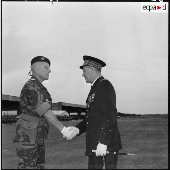 La Reghaïa. Base aérienne 146. Le général Jouhaud salue le colonel Coulet.