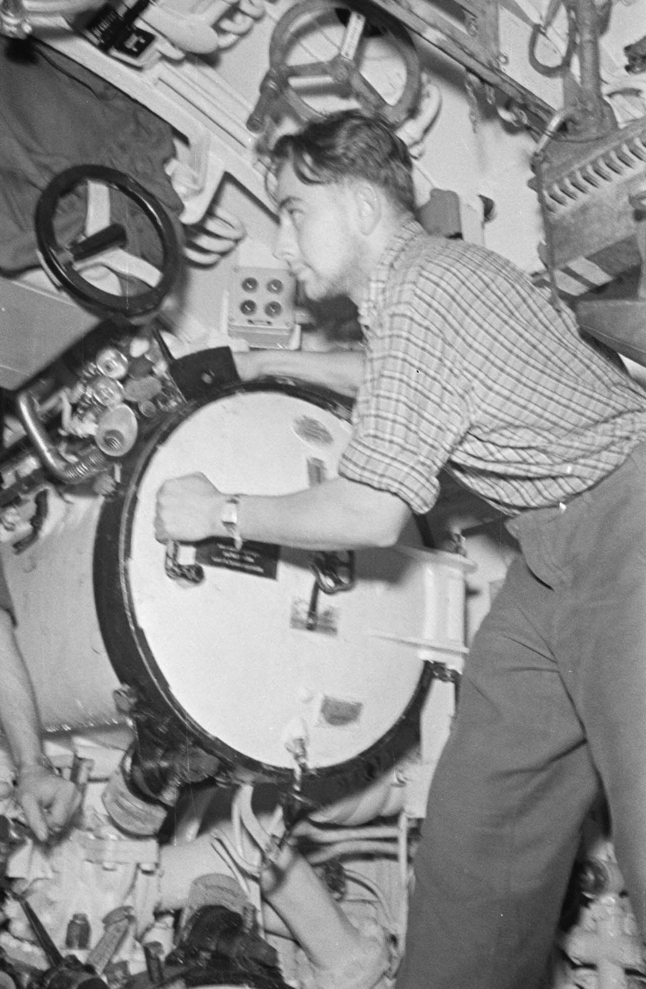 Deux sous-mariniers du U-boot U-203 actionnent les ballasts pour faire plonger le navire.