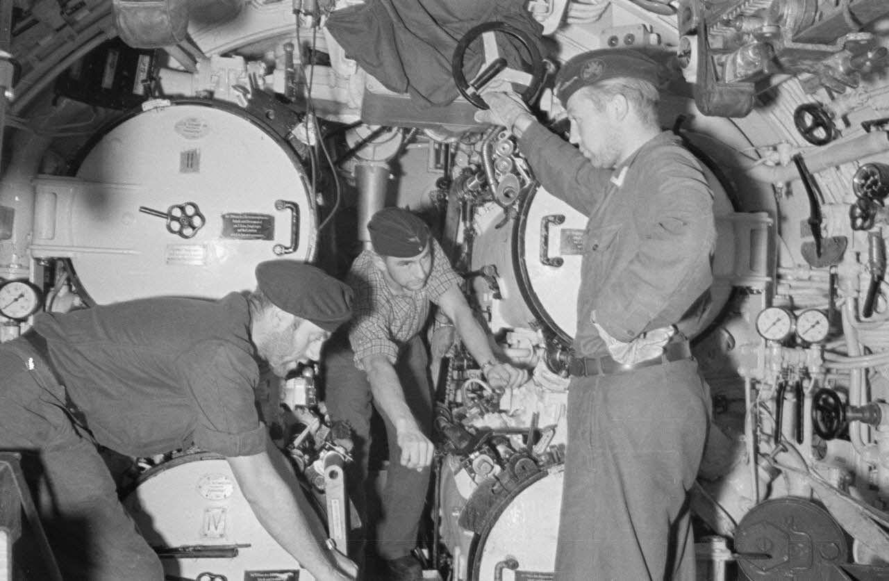 Deux sous-mariniers du U-boot U-203 actionnent les ballasts pour faire plonger le navire.