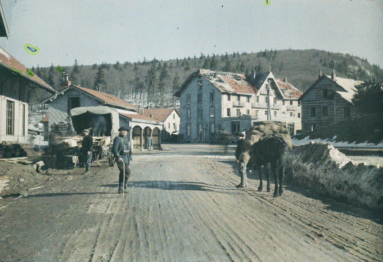 Cette autochrome correspond à l'une des références oméga 81 ou 82 du même auteur. La date diffère de deux jours par rapport à la vue N&B (soit Machard est revenu deux jours plus tard faire une vue en couleur, soit il y a une erreur de date pour un des deux clichés, ce qui est le plus probable car le même camion chargé de planches figure sur les eux photos).