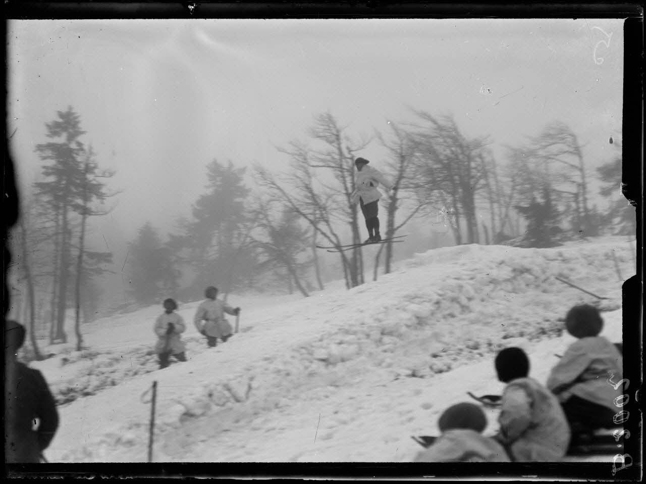 La Schlucht (près). Skieurs. Exercice de saut. [légende d'origine]
