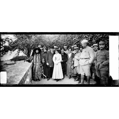 Boucq (Meurthe-et-Moselle). Le théâtre aux armées. Sur la terrasse du château : Mme Sarah Bernhardt, Mme Lucienne Breval, M. Duminy, Mme Duluc, M. Fursy et Melle Dussanne.