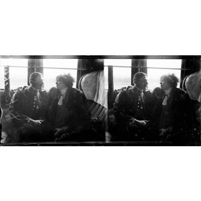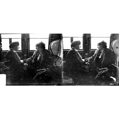 Le théâtre aux armées. Mme Sarah Bernhardt et Mme Lucienne Breval en wagon.