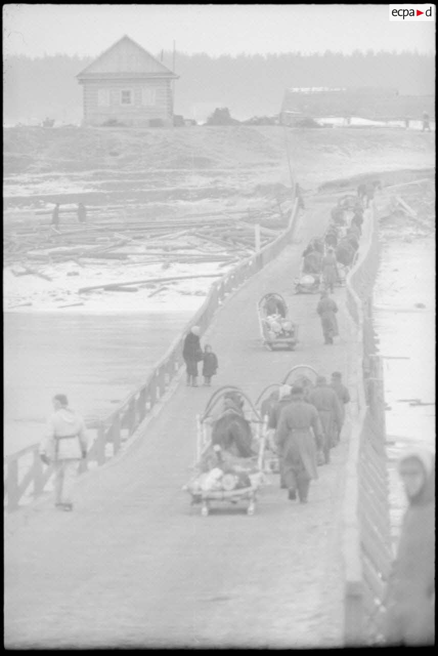 Construction d'un pont par l'Organisation Todt avec le soutien de prisonniers soviétiques.