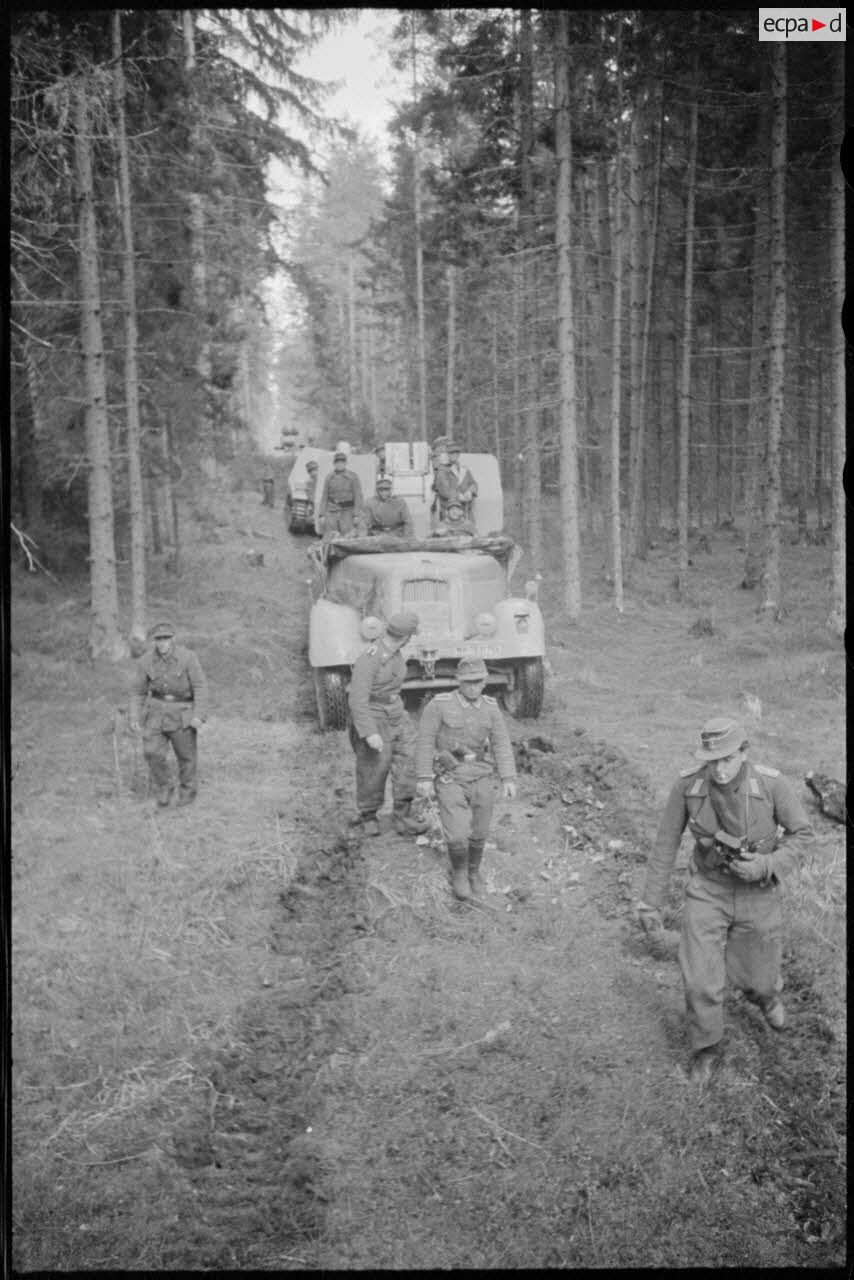La traversée d'une forêt par des canons automoteurs Nashorn du 519e bataillon lourd de chasseurs de chars (Schwere Panzerjäger Abteilung 519).