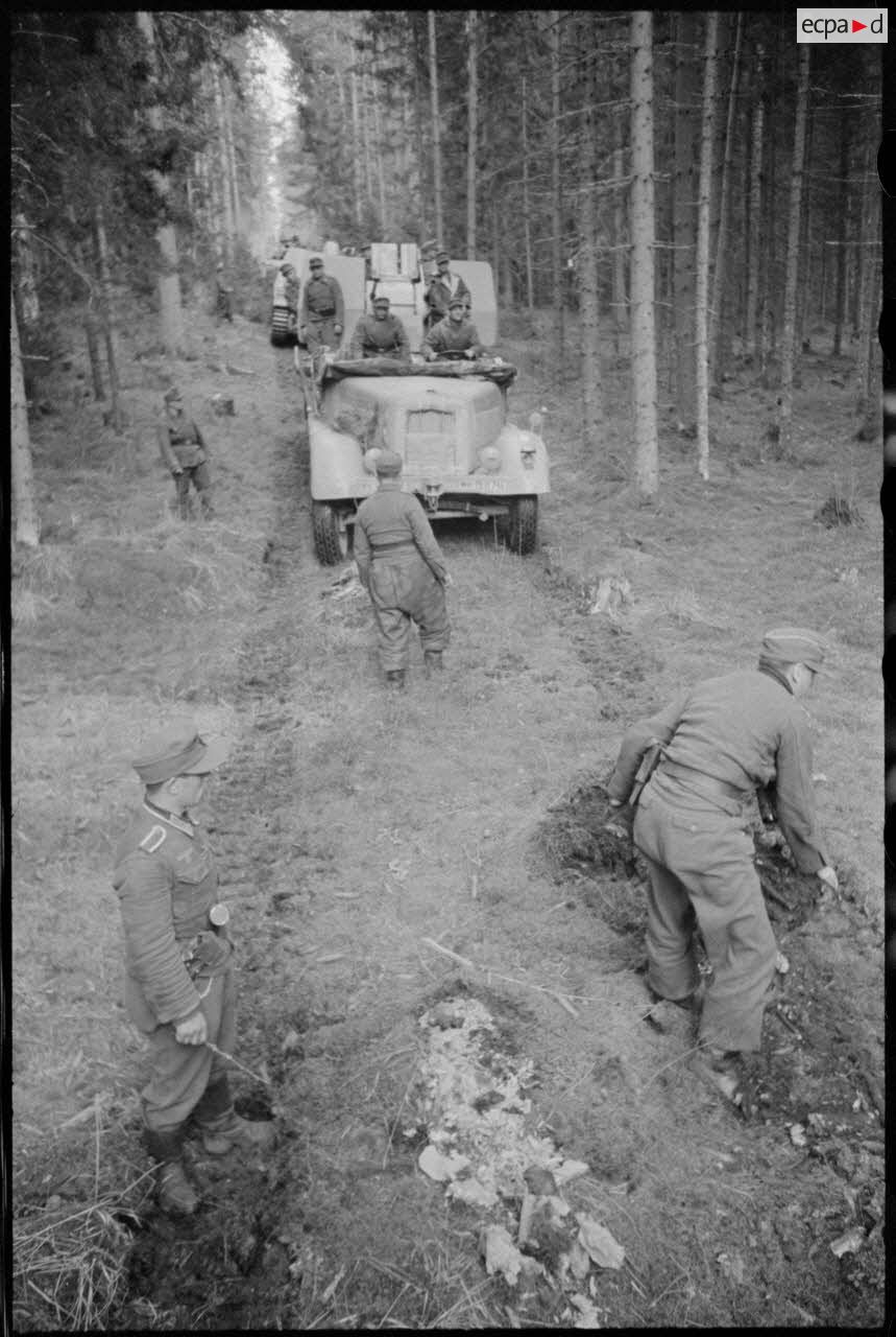 Des arbres ont été volontairement coupés par la résistance pour interdire la progression des véhicules allemandes, ici des Nashorn du Schwere Panzer Abteilung 519.