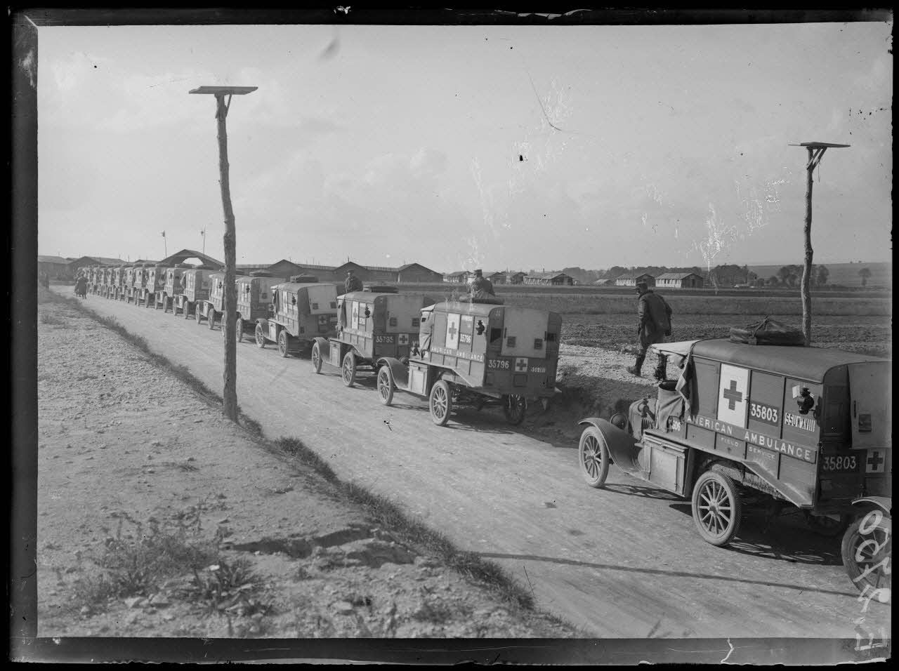 La Veuve. Marne. Hôpital d'évacuation sur la route de Châlons à Reims. Convoi de blessés dans des ambulances américaines. [légende d'origine]