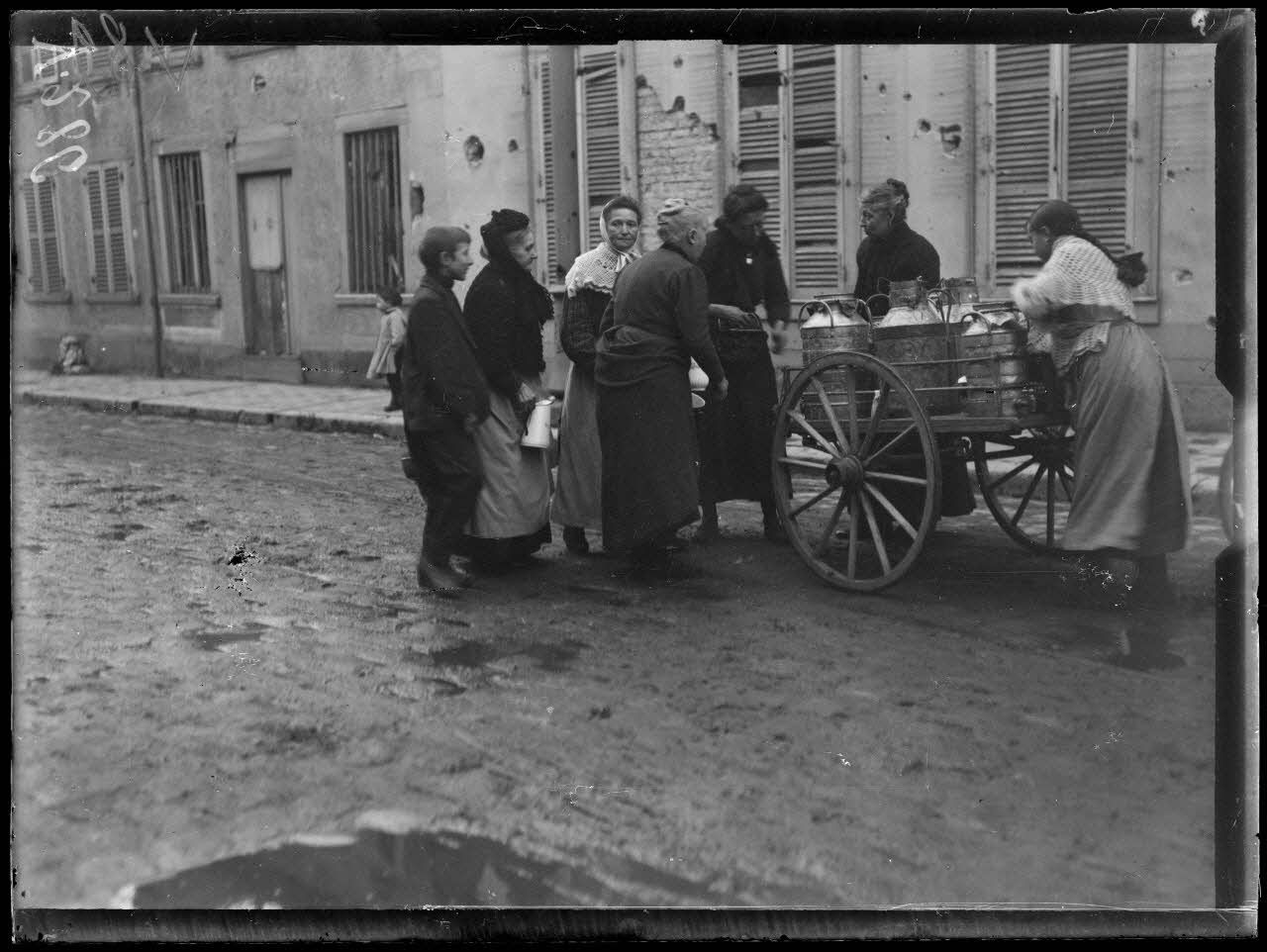 Une laitière vend son lait au coin d'une rue.