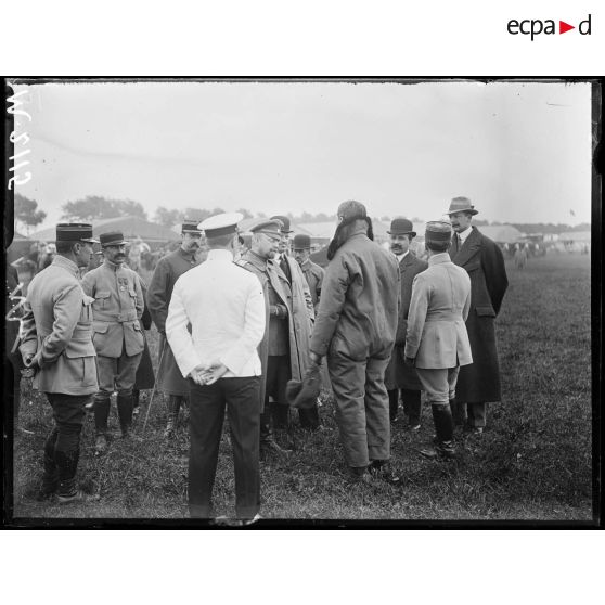 Champ d'aviation du Bourget, félicitations d'un aviateur par les membres de la délégation parlementaire russe.