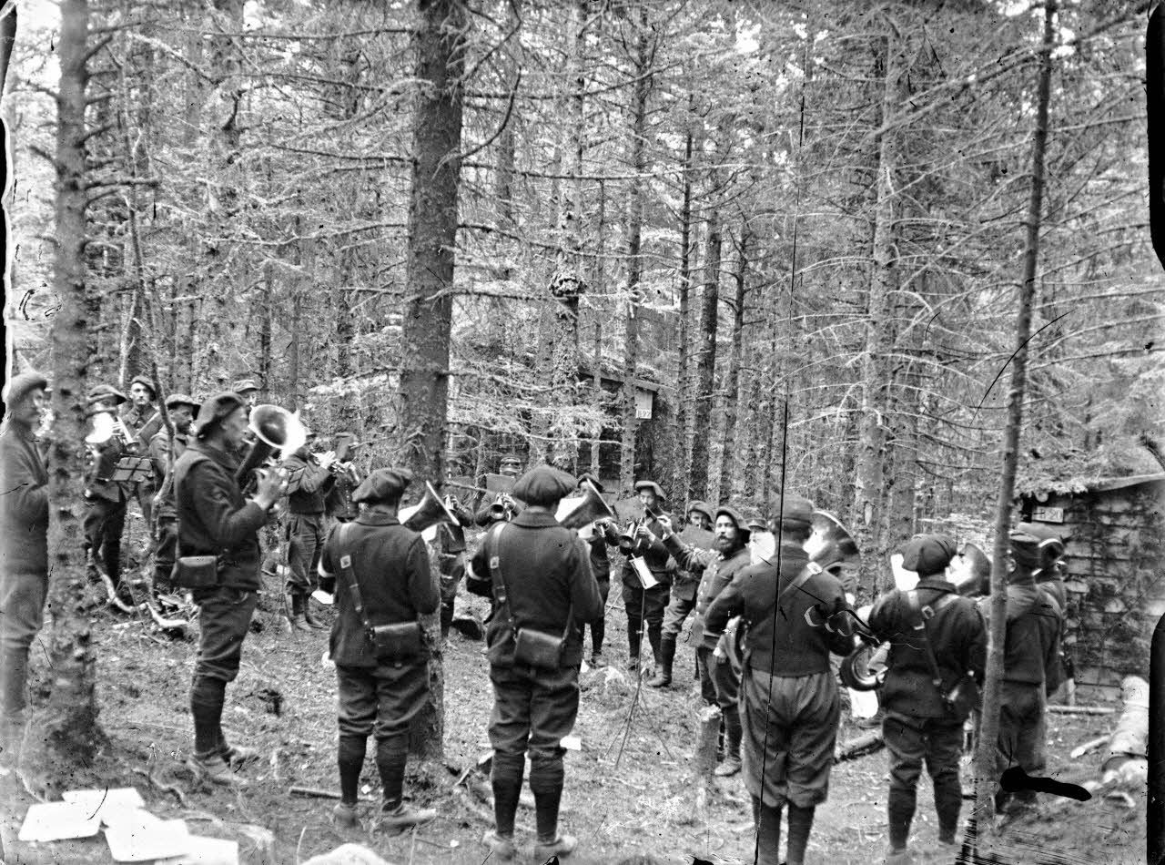 Lac Noir : fanfare du 30e Alpins et 120e chasseurs jouant à 1500 mètres. [légende d'origine]