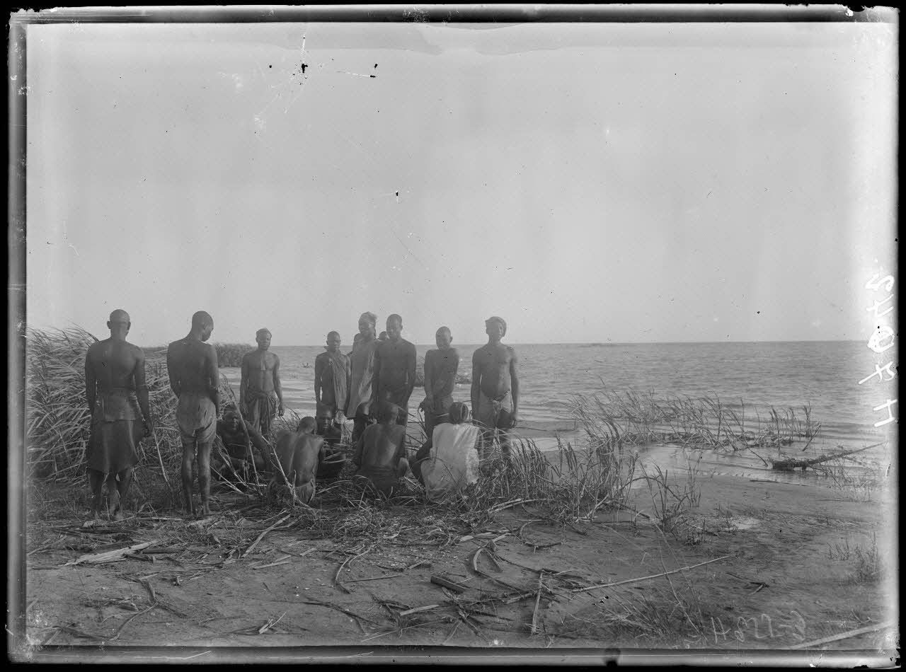 Puis c'est l'arrivée à l'embouchure du Chari, sur le lac Tchad, où la mission reste deux jours et campe au bord de l'eau. L'opérateur prend des clichés des deux pirogues duconvoi, des rives du lac, des pagayeurs posant avec leurs perches et leurs pagaies dressées vers le ciel. Le lac est bordé d'une végétation de roseaux et de papyrus dont les riverains construisent des pirogues.