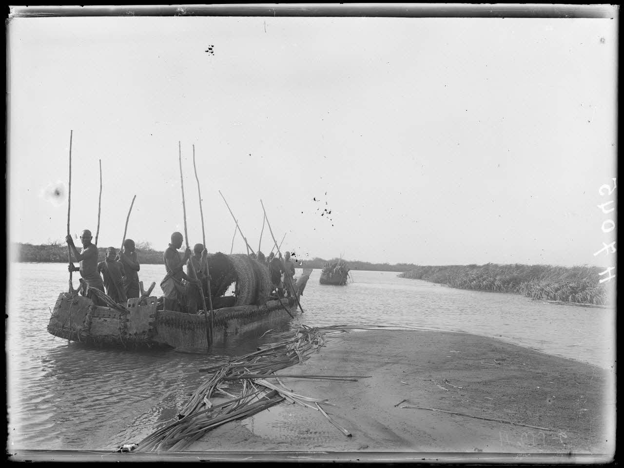 Après ce séjour sur le lac, la mission reprend le chemin du sud et remonte le cours du Chari. le convoi fait escale à Kobro, village déjà traversé à l'aller. Les tirailleurs accompagnant la mission se reposent sous leurs moustiquaires et l'opérateur photographie les cases. A Mouloua (Moulouang), en amont, on cultive le Nilé. A Partir de Kousseri, après le confluent du Chari et du Logone, la navigation se poursuit vers le sud en remontant le cours de ce dernier. Sur les bords du fleuve des bûcherons exploitent du bois de chauffage.