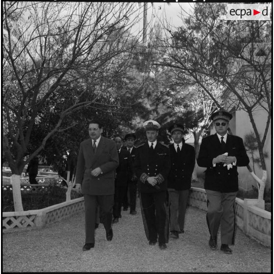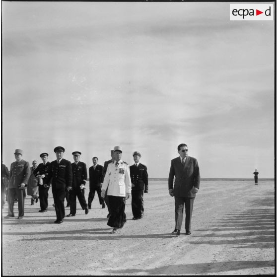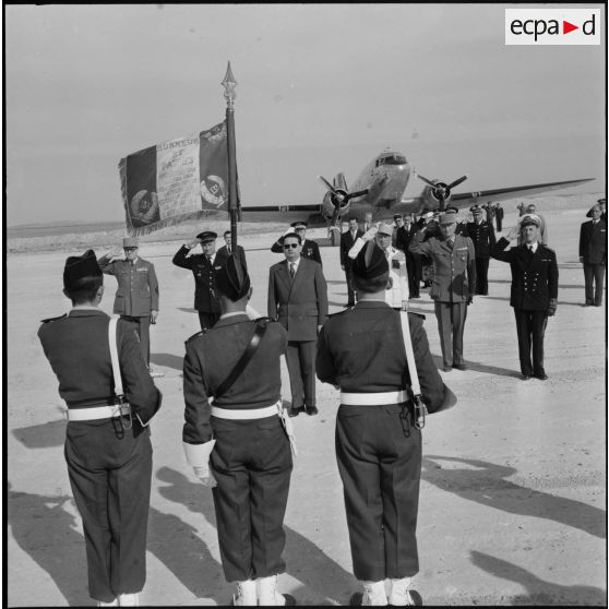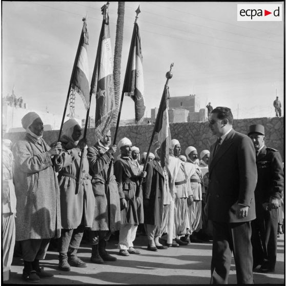 Laghouat. Voyage d'inspection. Jacques Soustelle salue les couleurs.