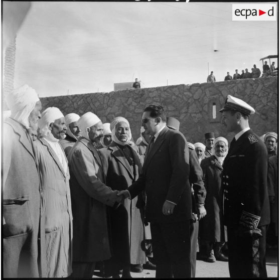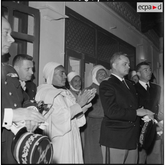 Sahara. Voyage d'inspection. Les autorités locales applaudissent le discours de Jacques Soustelle.